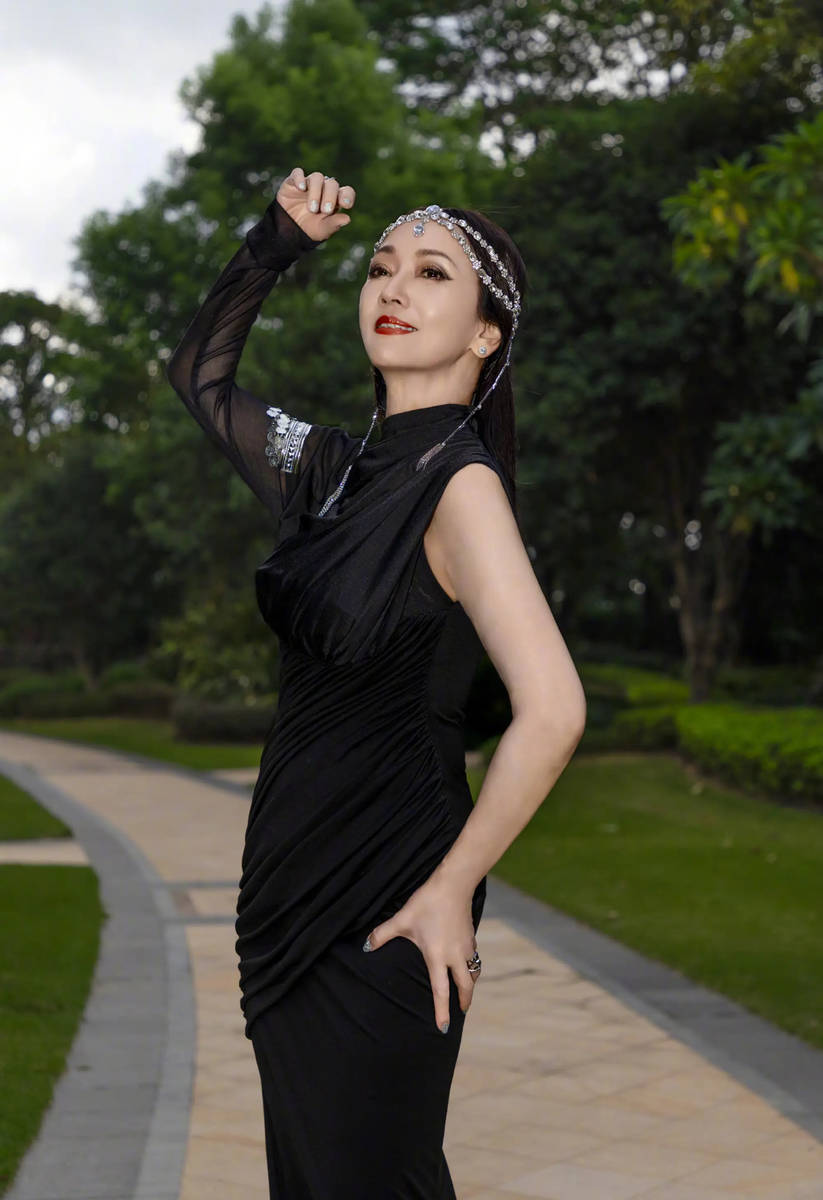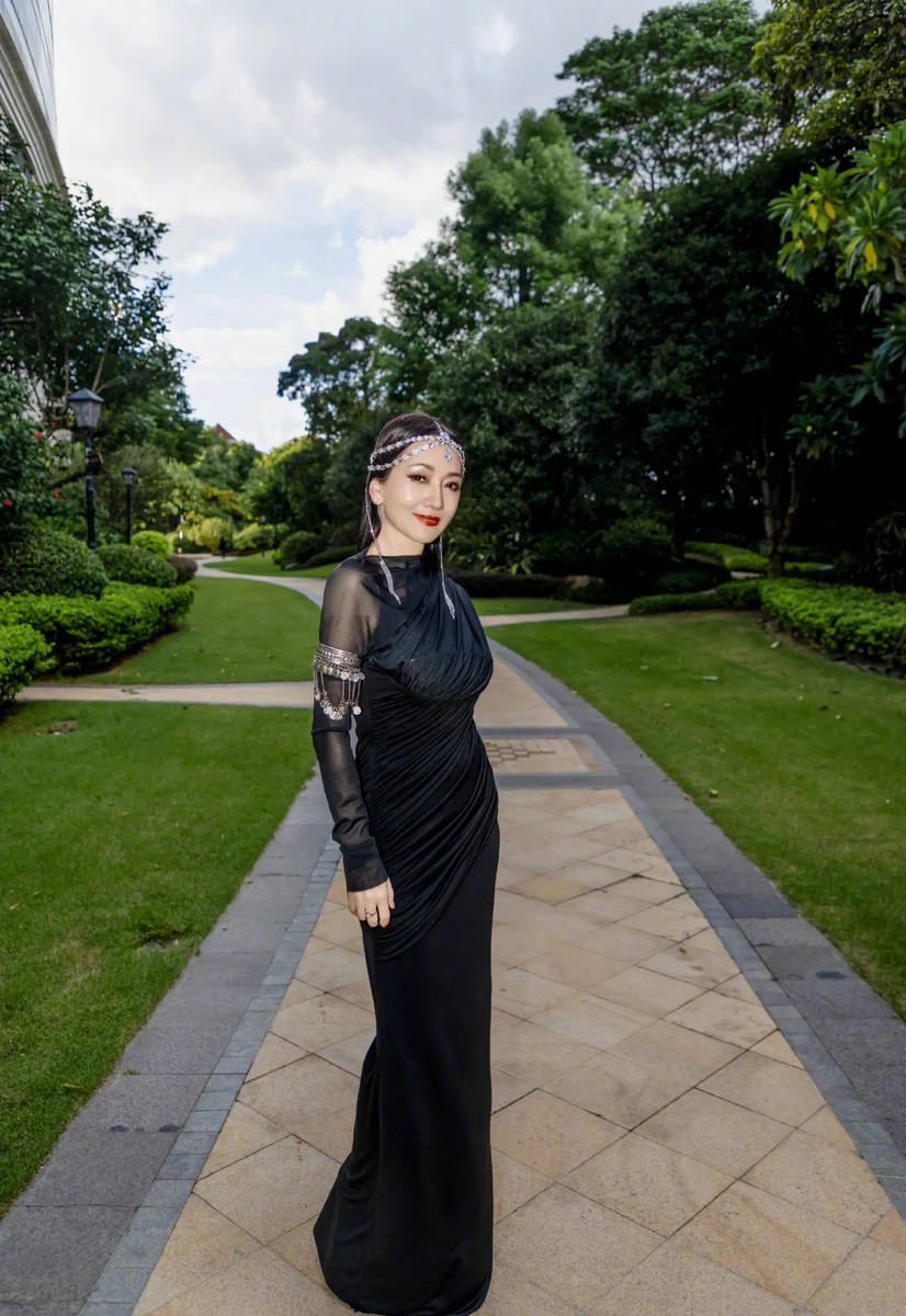 此次红毯造型中,黑色长裙无疑是视觉焦点。选用质感上乘的黑色丝绸面料,随着步态流转泛起细腻光泽,既贴合身形勾勒出纤瘦有型的曲线,又通过简约剪裁传递出端庄大气的格调。裙身恰到好处的垂坠感弱化了年龄痕迹,而含蓄的细节设计更显巧思 —— 虽无繁复装饰,却以利落线条凸显身姿,站在红毯聚光灯下时,宛如从光影中走出的优雅使者。与常见的亮色礼服不同,这条黑裙更能衬托出她白皙的肤色,红唇点缀其间,形成经典而醒目的视觉对比,将成熟女性的韵味展现得淋漓尽致。