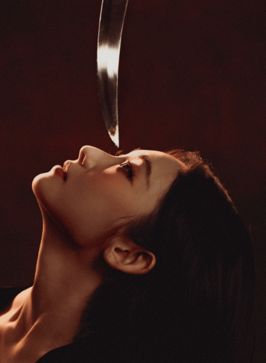ㅤ 利刃元素的加入堪称点睛之笔,让自由主题有了具象化表达。在一张侧影镜头中,她指尖轻握银色利刃,刀刃反光与红唇色泽形成强烈视觉冲击,眼神锐利如锋,彻底颠覆了昔日 “芭蕾乖乖女” 的柔和形象。这一道具并非单纯的装饰,而是对 “打破束缚” 的隐喻 —— 正如她从被定型的风格中突围,用利刃般的勇气撕开标签枷锁。道具与造型的呼应恰到好处:刀柄的金属质感与耳间的几何耳环形成细节联动,既强化了整体的酷感基调,又暗合 “以锋利姿态拥抱自由” 的深层内涵。