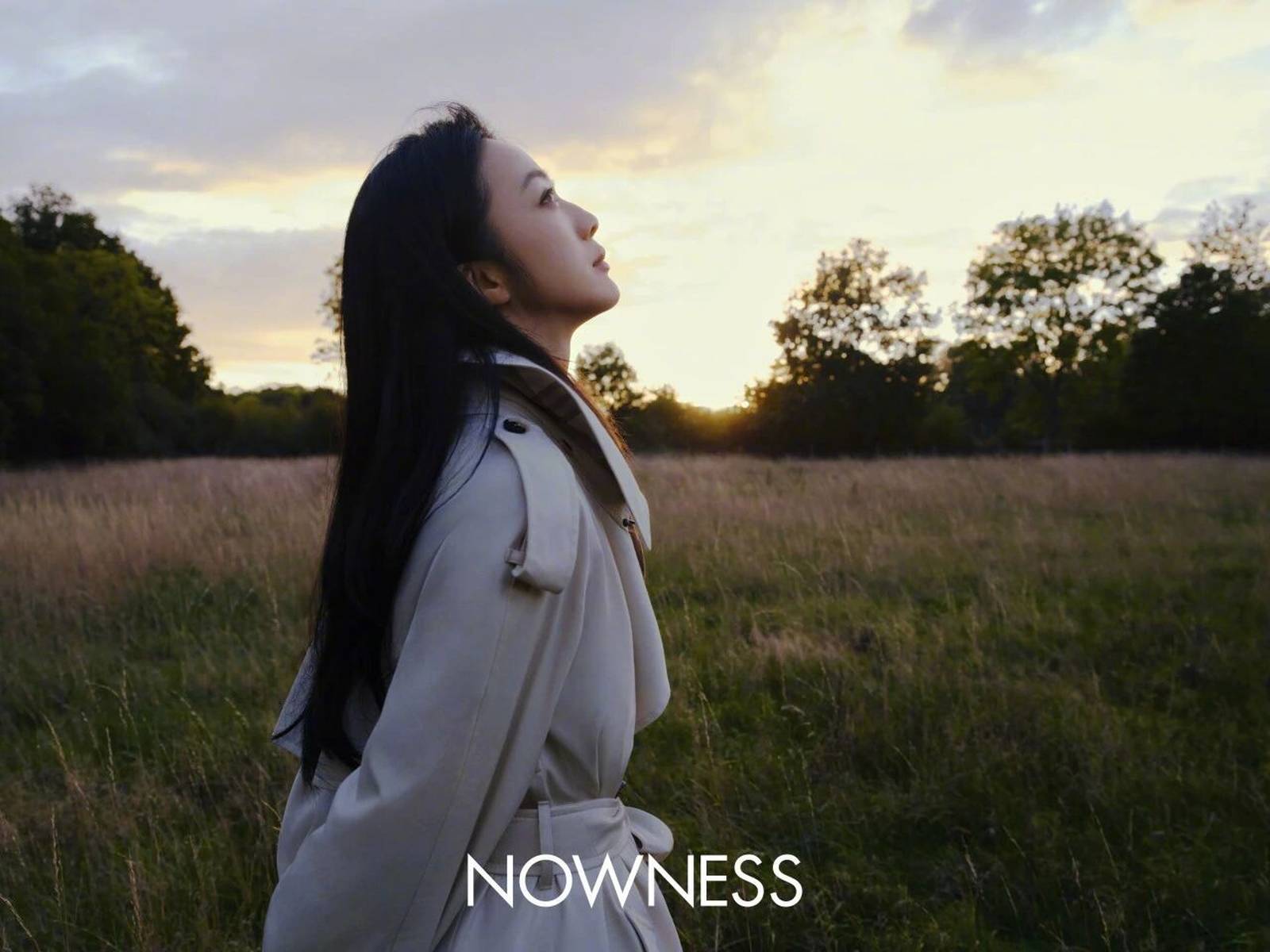 那件米色风衣无疑是造型的灵魂。不同于亮色的张扬,浅淡的米色调与草地的鲜绿形成温柔碰撞,既衬得她肤色通透,又与自然背景无缝相融。风衣的剪裁延续了经典廓形,线条顺直却不僵硬,肩部的弧度柔和利落,走动时下摆随步伐扬起轻盈弧度,躺卧时则自然垂落,将 “灵动” 二字具象化。面料看似轻薄却自带挺括质感,阳光穿过衣料留下朦胧光影,隐约可见衣身暗藏的细腻纹路,低调中藏着考究细节,恰如汤唯本人的气质。